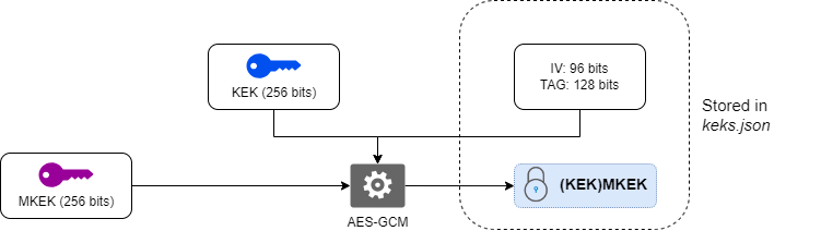 For more information on aes-256-gcm encryption to generate the MKEK, the encrypted KEK, the initialization vector and the tag, see the ANSSI document ANSSI-PG-083.