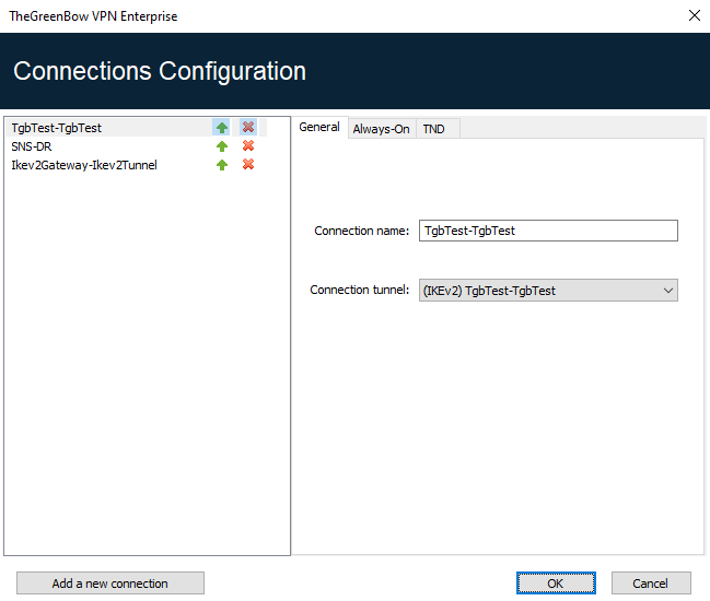 To create a new VPN connection, click Add a new connection, choose a name and select the corresponding VPN tunnel. If a Remote Desktop Sharing connection is configured, an option used to select it automatically appears below the selected tunnel. Once they have been confirmed, changes made in the Connection Panel configuration window instantly appear in the Connection Panel.