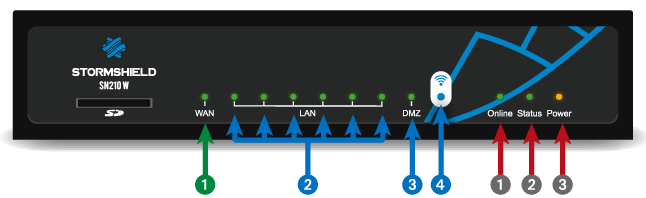 | 3 | The USB port makes it possible to access the product in console mode**; the user can connect to the firewall directly from a computer. The default baud rate on these models is 115200 baud (8N1). |