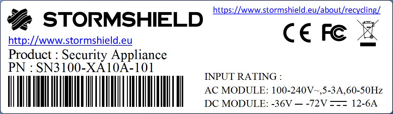These labels indicate the information relating to the firewall (product reference, part number, serial number, software version installed, etc). Check that this information matches your order. You can also check whether the version installed has been certified. |