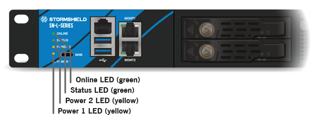 Plug your Stormshield Network firewall into the mains power supply. As soon as the appliance is powered up, press once on the Power button (rear panel). Wait a few minutes for all 4 LEDs – Online, Status, Power 1 and Power 2 to light up.