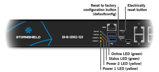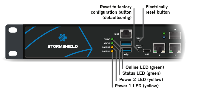 Plug your Stormshield Network firewall into the mains power supply. Ensure that both power supply switches are ON. Your firewall will then start running automatically, the Power LED will light up. Wait a few minutes for all 4 LEDs – Online, Status, Power 1 and Power 2 to light up.