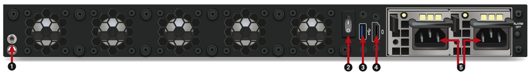 1 : Branchement de mise à la terre 2 : Bouton d'alimentation 3 : Port USB 3.0 4 : Port HDMI : branchement de l'écran 5 : Embases secteur pour la redondance d'alimentation. |