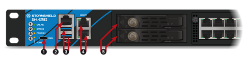 1 : Port série USB-C en mode console 2 : Port série RJ45 en mode console 3 : Ports USB 3.0 4 : Ports dédiés au management du produit (MGMT1 et MGMT2) 5 : Racks des SSD pour le stockage des traces |
