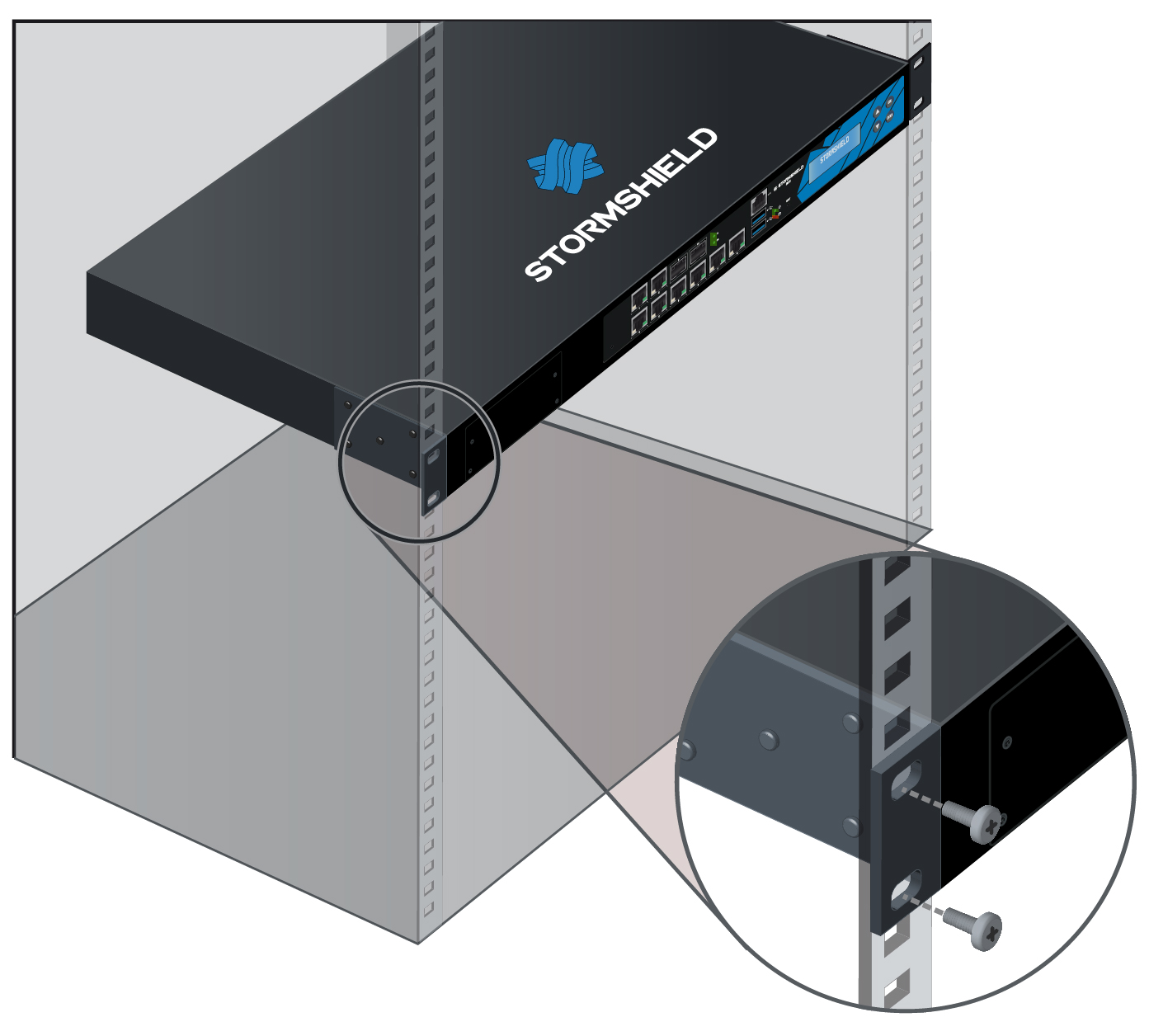 Tous les produits Stormshield Network Security peuvent être installés dans des baies 19 pouces (sauf SNi20, SNi40 et SNxr1200). Un système de fixation pour mise en baie, sous forme de plateau rackable qui peut contenir deux firewalls, peut être livré sur commande pour les modèles SN160, SN160W, SN210, SN210W, SN310, SN-XS-Series-170, SN-S-Series-220, SN-S-Series-320 et SNi10.