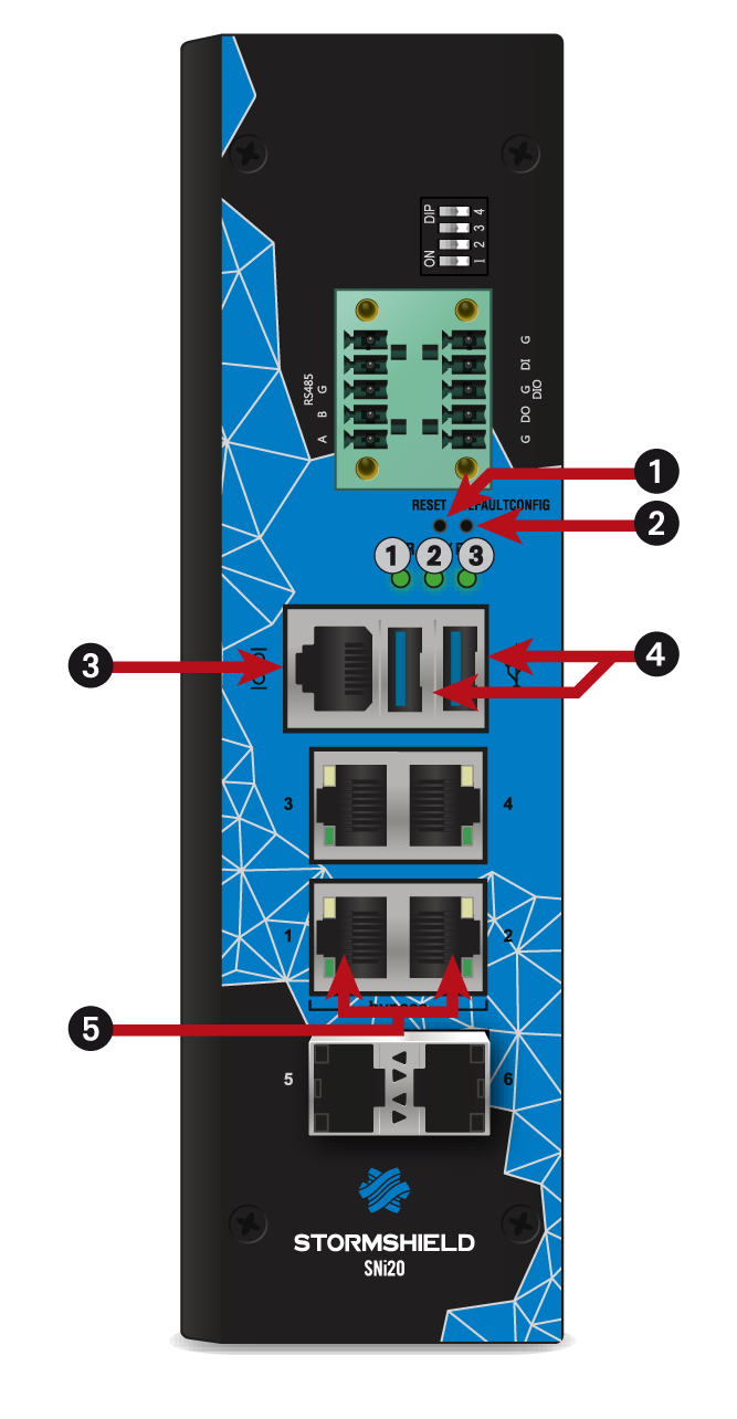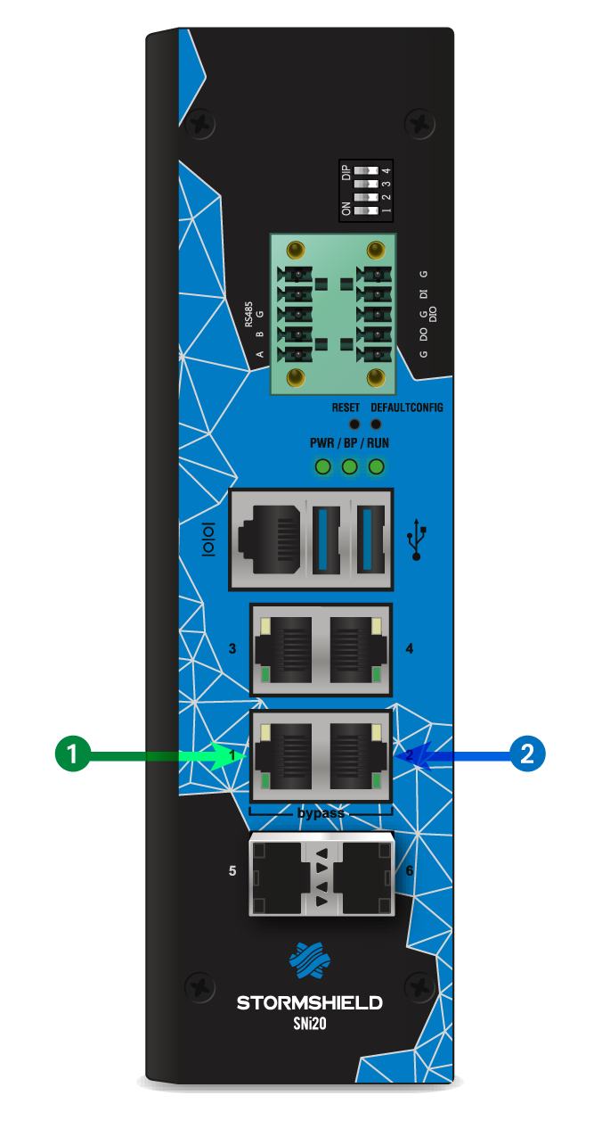 Afin d’assurer une continuité de service dans les milieux industriels, le firewall SNi20 est équipé d’un bypass matériel qui permet, une fois activé, de laisser passer le trafic réseau en cas de coupure électrique ou de défaillance du boîtier.