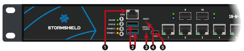 | 5 | Le port USB-C permet d’accéder au produit en mode console* ; il est possible de se connecter directement au firewall depuis un ordinateur. Le Baudrate par défaut sur ce modèle est 115200 bauds (8N1). |