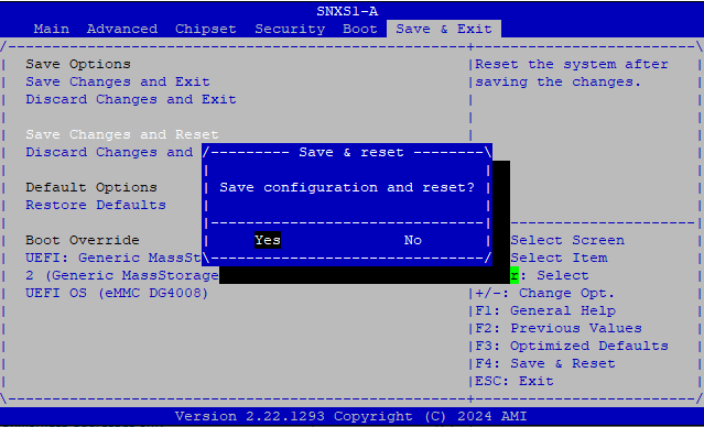 - Sélectionnez le panneau Save & Exit et choisissez l’option Save Changes and Reset.
