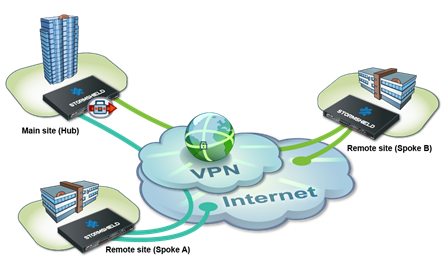 The following is an example of BGP dynamic routing in a hub and spoke, or star, VPN topology.