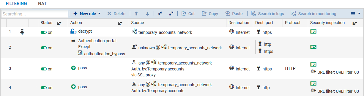 The filter policy described below allows temporary account users to access websites in HTTP and HTTPS with URL filtering.