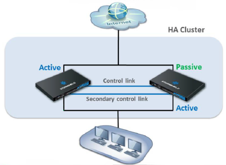 High availability (HA) is a feature that provides service continuity during a hardware or firewall failure, by deploying a cluster of firewalls. In this architecture, the links that interconnect the LAN and WAN must be duplicated, as shown below: