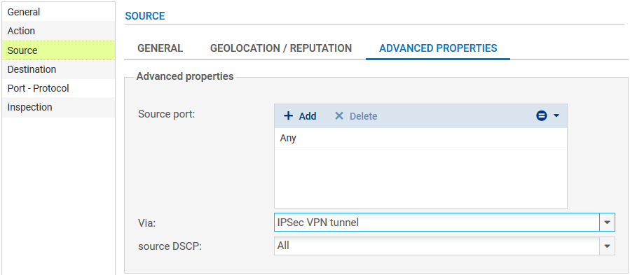 For better security, you can create a more restrictive rule on the Firewall that hosts the intranet server by specifying the source of the packets. To do so, when selecting the traffic source, indicate the value “IPsec VPN tunnel” in the field Via (Advanced properties tab):