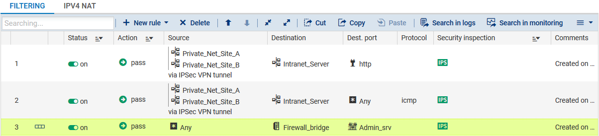 In the case presented, client workstations located on remote sites must be able to connect in HTTP to the intranet server located on the local network of the main site (rule no. 1). You can also temporarily add, for example, ICMP to test the setup of the tunnel more easily (rule no. 2).