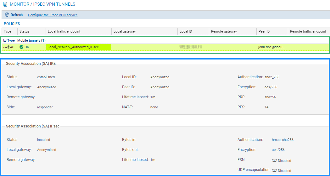 The Monitoring > IPsec VPN tunnel monitoring module shows the tunnels that have been set up and information and statistics about them: