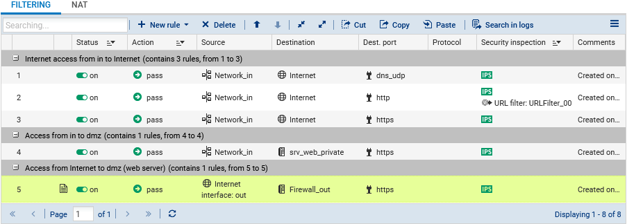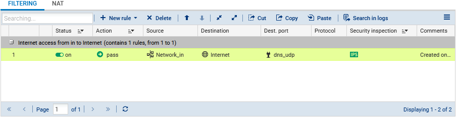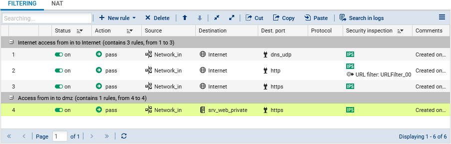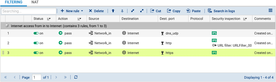 The filter policy can be configured in Configuration > Security Policy > Filter - NAT, Filtering tab.