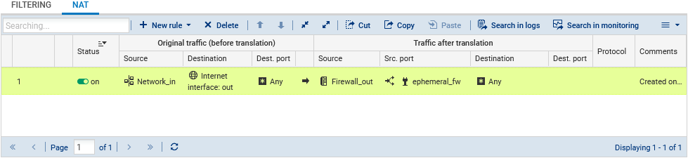 The NAT policy can be configured in Configuration > Security Policy > Filter - NAT, NAT tab.