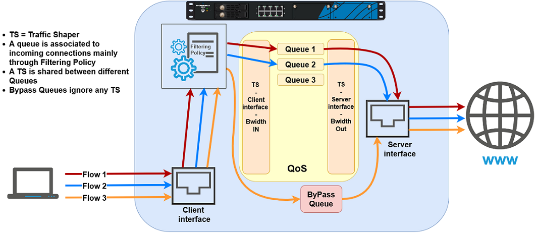 The volume of data exchanged is regulated by a traffic shaper associated with QoS queues. This traffic shaper applies to the outgoing interface of processed packets.
