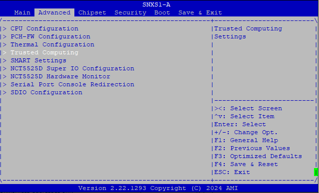 As soon as the Stormshield logo appears on the screen, or the POST appears through the console, press [Del] to access BIOS. - Use the relevant arrows to go to the Advanced panel, select Trusted Computing and press [Enter].