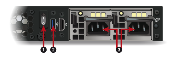 1: On/off switches 2: USB 3.0 port 3: Sockets for mains power supply |