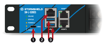 1: USB-C port console access 2: Serial port for access in console mode 3: USB 3.0 port |