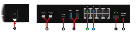 1: Location of the microSD card 2: Mains sockets to be screwed in 3: USB-C port console access 4: USB 3.0 port 5: OUT port 6: IN port 7: SFP port 8: Button to reset the appliance to its factory settings (defaultconfig). |