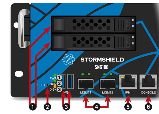 1: SSD racks 2: Reset button (electrically resets the firewall) 3: USB 3.0 port 4: Management ports 5: IPMI network port 6: Serial port for access in console mode |