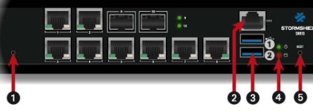 1: Serial port for access in console mode 2: USB 3.0 port 3: Reset button (electrically resets the firewall) 4: Button to reset the appliance to its factory settings (defaultconfig). 5: Micro USB port |