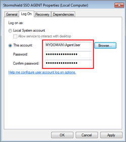 If SN SSO Agent was installed on a workstation other than the domain controller, the login and password for the Active Directory user account must be entered in the Log On tab.