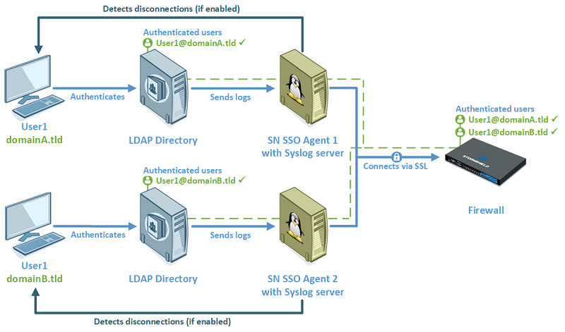 Whenever a firewall manages several authentication domains, regardless of whether they are non-Microsoft LDAP directories and/or Active Directories, an SN SSO Agent must be dedicated to each domain. Each firewall can manage up to five SN SSO Agents, therefore up to five different authentication domains.