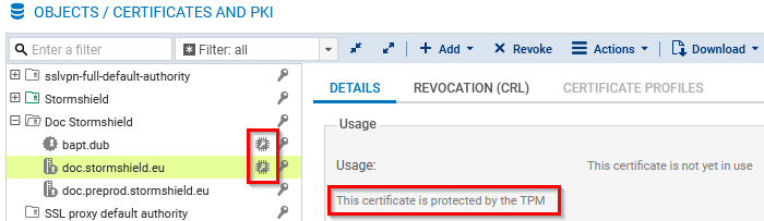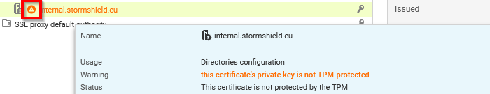 icon indicates that the certificate is used in the SNS firewall configuration, but its private key is not protected by the TPM. This information is also available in the tooltip that appears when scrolling over the certificate.