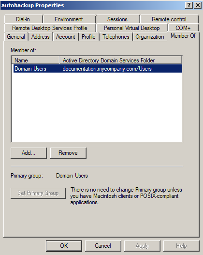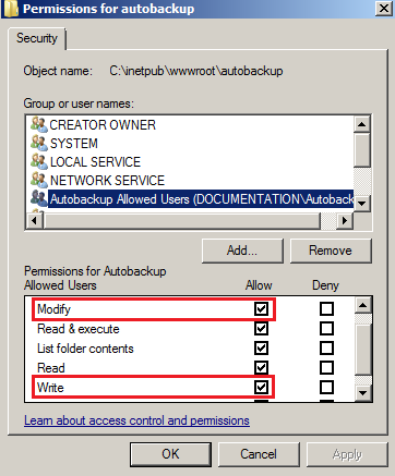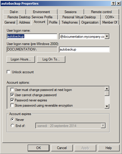 Dans cet exemple, le compte utilisé s’appelle autobackup et appartient au groupe Autobackup Allowed Users spécifiquement créé pour cet usage. Les droits d’écriture sur le répertoire dédié aux sauvegardes pourront être définis dans le paramétrage du site WebDAV.