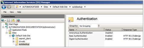 Dans cet exemple, le site utilisé pour recevoir et stocker les sauvegardes n'est pas Default Web Site, mais un site dédié nommé autobackup, dont le répertoire de base est situé sous la racine de Default Web Site (c:\inetpub\wwwroot).