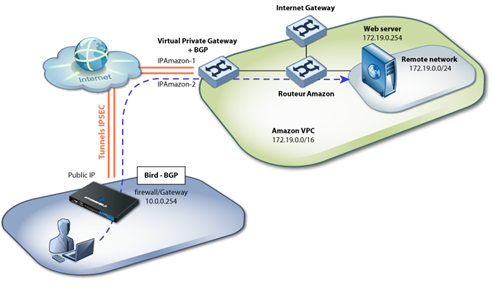 Le but est de relier un réseau local à un VPC Amazon (Virtual Private Cloud). Pour cela, Amazon propose la création de deux tunnels routés entre le firewall local et le Cloud Amazon et de router ce trafic via BGP.
