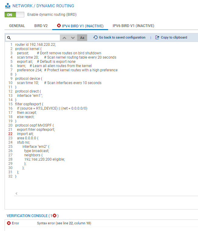 Lorsque vous cliquez sur le bouton Vérifier la configuration depuis l'un des onglets de configuration BIRD présentés ci-dessus, la console de contrôle située en bas de l'écran affiche les éventuelles erreurs de syntaxe rencontrées.