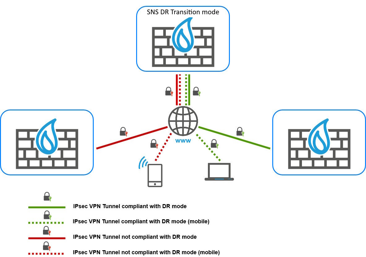La version 5 de SNS permet de configurer des tunnels VPN IPsec respectant les exigences du mode DR, tout en conservant la possibilité d'établir des tunnels VPN IPsec ne respectant pas ces exigences. Cette fonctionnalité s'applique aux architectures complexes dont le processus de mise en conformité avec le mode DR doit passer par une phase de transition pendant laquelle des politiques IPsec DR et standard (non-DR) seront amenées à coexister.