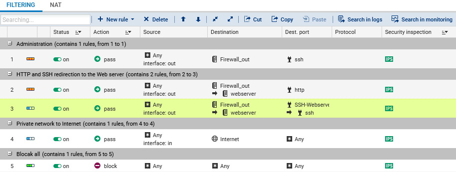 Allez dans l'onglet Configuration > menu Politique de sécurité > Filtrage et NAT.