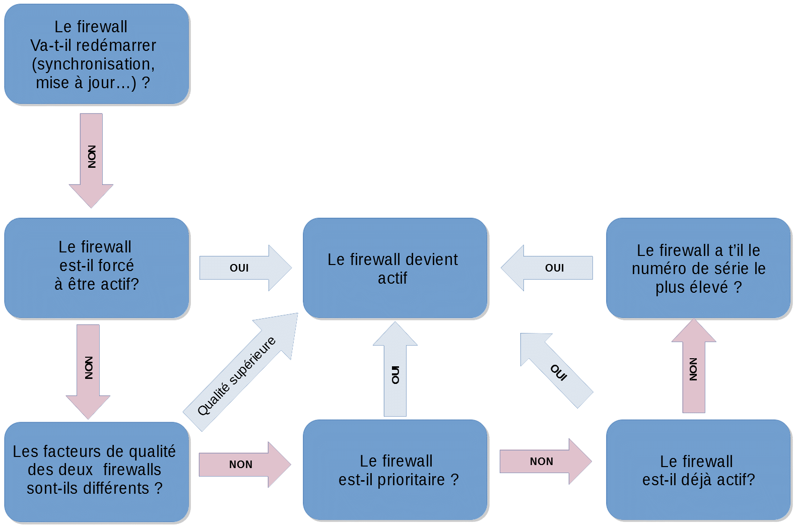 Il est important de noter qu'il est possible de forcer un firewall à être actif (menu Configuration > Système > Maintenance > Configuration > Haute disponibilité). Dans ce cas, ce firewall sera actif même si son facteur de qualité est inférieur. Il est déconseillé d'utiliser cette option pour un cluster en production. Cette option est à réserver pour le débogage d'une configuration.