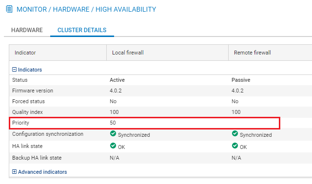 Lorsqu'un firewall a été choisi comme firewall actif par défaut, sa priorité devient alors égale à 50 (pas de priorité définie pour l'autre membre du cluster) :
