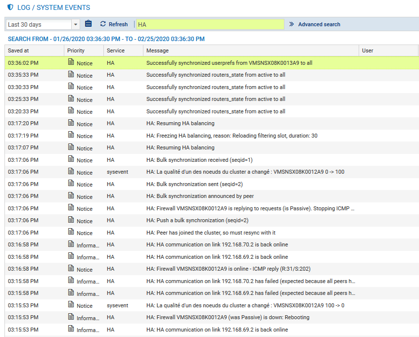 Ils peuvent être consultés par le biais du menu Monitoring > Logs - Journaux d'audit > Événements système de l'interface Web d'administration du firewall (ci-dessous avec un filtre sur le terme HA) :