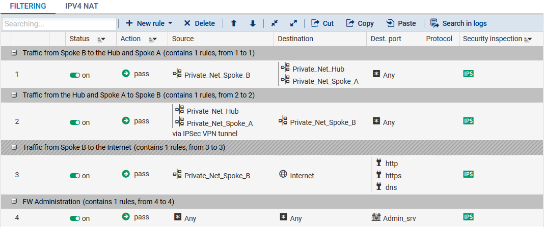 Définissez les règles de filtrage nécessaires au dialogue entre Spoke A et Spoke B, Spoke A et Hub ainsi qu’au trafic local vers Internet :