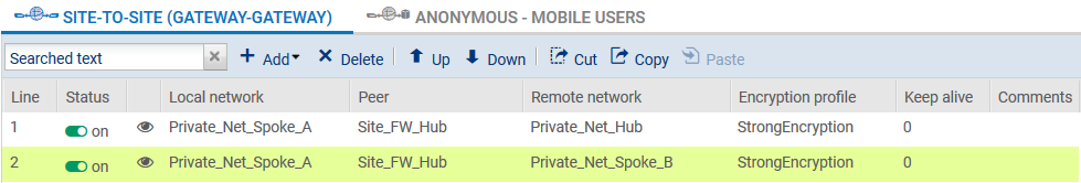 Dans ce didacticiel, le trafic entre les réseaux privés n’est volontairement pas précisé (port destination : ANY). Pour des raisons d’optimisation de performances (économie de bande passante et de ressources machine), il est important d’affiner le filtrage sur les sites satellites (protocoles, ports… autorisés) afin d’éviter de laisser transiter des paquets inutiles dans les tunnels. Cette politique de filtrage sera également présente sur le site Hub.
