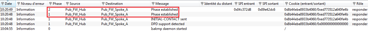 Dans le module Traces > VPN de Stormshield Network Real-Time Monitor, vérifiez que les phases 1 et 2 se sont correctement déroulées (messages « Phase established ») :