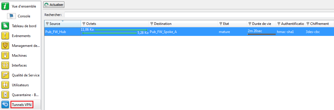 Dans le module Tunnels VPN, vous pouvez également visualiser ce premier tunnel ainsi que la quantité de données échangées :