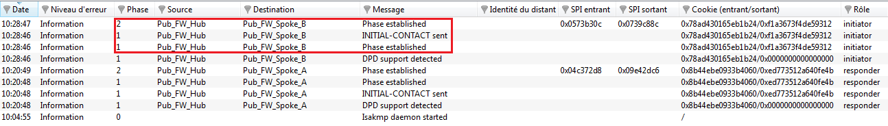 Depuis un poste client situé sur le site Spoke A, établissez tout d’abord une connexion vers une machine du site Hub (via un Ping par exemple, si vous avez autorisé le protocole ICMP dans l’ensemble des règles de filtrage), afin de tester l’établissement du premier tunnel (Spoke A vers Hub).