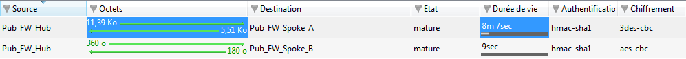 - L’état du tunnel : « state=mature ». Cet état peut être mature (le tunnel est correctement établi : la SA est disponible et utilisable), larval (la SA est en cours de négociation) ou dying (la SA est arrivée au terme de sa durée de vie et sera renégociée lorsque du trafic le nécessitera).