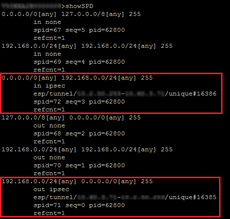 La commande showSPD présente la politique IPsec active sur le Firewall. Son résultat est identique, que des tunnels soient établis ou non.