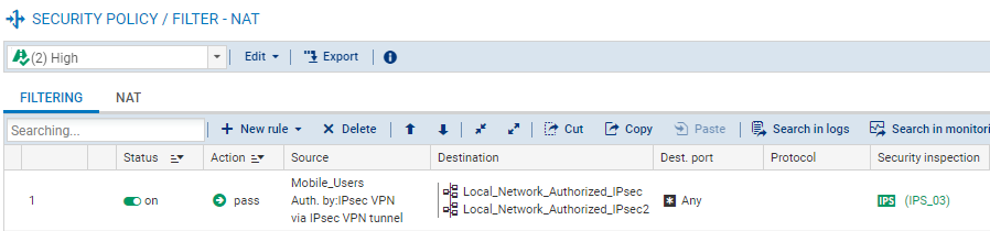 Dans le module Configuration > Politique de sécurité > Filtrage et NAT> onglet Filtrage :