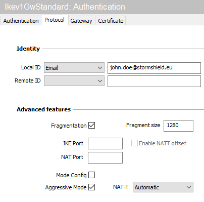 - Dans l'onglet Protocole > Fonctions avancées, cochez la case Fragmentation et indiquez la taille des fragments IKE tels que définis au niveau du firewall (1280 octets selon les recommandations de Stormshield).