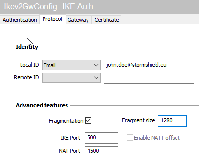 - Dans l'onglet Protocole > Fonctions avancées, cochez la case Fragmentation et indiquez la taille des fragments IKE tels que définis au niveau du firewall (1280 octets selon les recommandations de Stormshield).