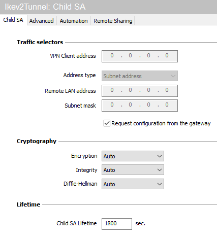 - Dans l'onglet Child SA > Trafic sélecteurs, cochez la case Obtenir la configuration depuis la passerelle.